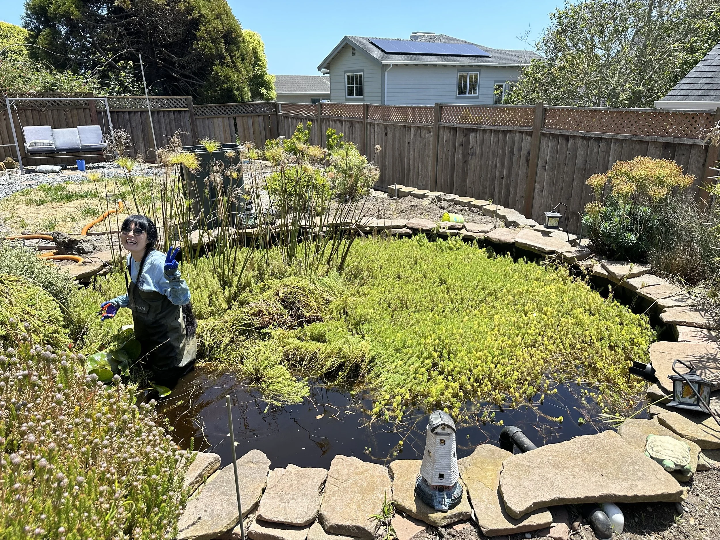 After moving to the Bay, I worked for a textile company during the day and did the paperwork for Elan’s Ponds and Aquariums at night, occasionally cleaning ponds on holidays and weekends with Elan. In 2024, the business grew so much that it was time for me to join all-in.